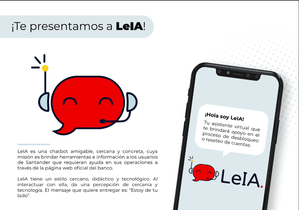 El proyecto que se llevó a cabo para Banco Santander tuvo como objetivo el desarrollo de la identidad del chatbot LeIA y la especificación detallada de sus diálogos, considerando esta herramienta un elemento esencial de interacción con la plataforma digital del banco.